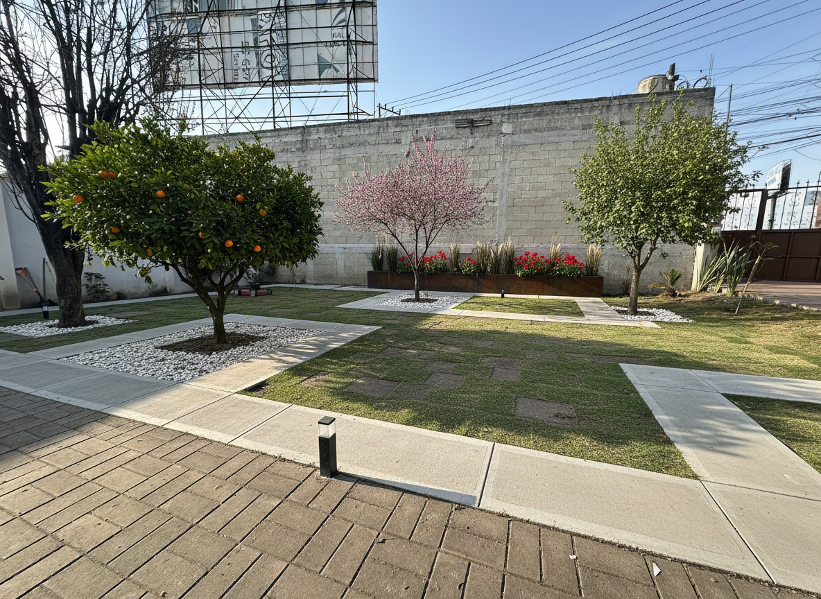 Puedes coocarle pasto a este espacio? Y sustituir el fornio verde por una bugambilia rosa mediana?