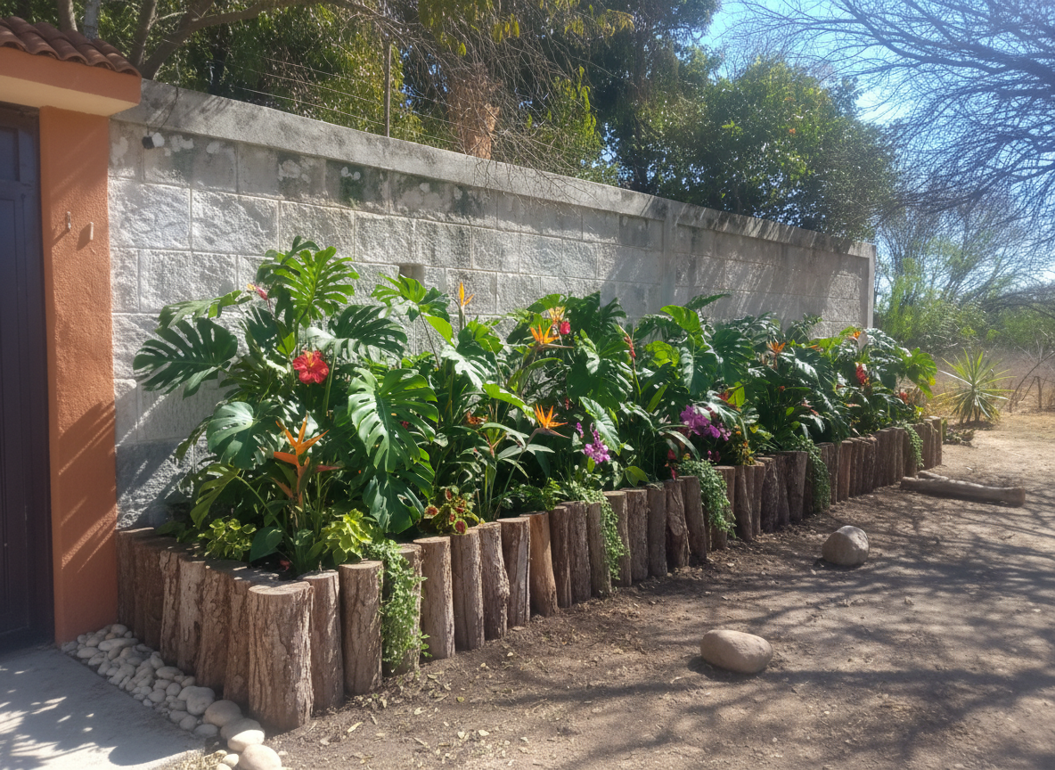 Coloca una jardinera en toda la extensión de la pared, bordeado de troncos. Utiliza vegetación para sol y hazlo super cozy.