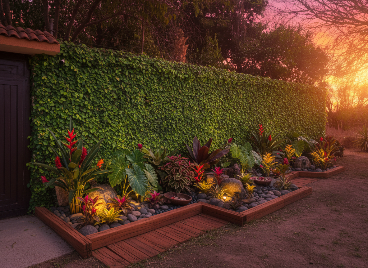 Cubre la pared con enredadera moneda, coloca plantas de colores, decoración de madera, piedras y rocas grandes e iluminación.
