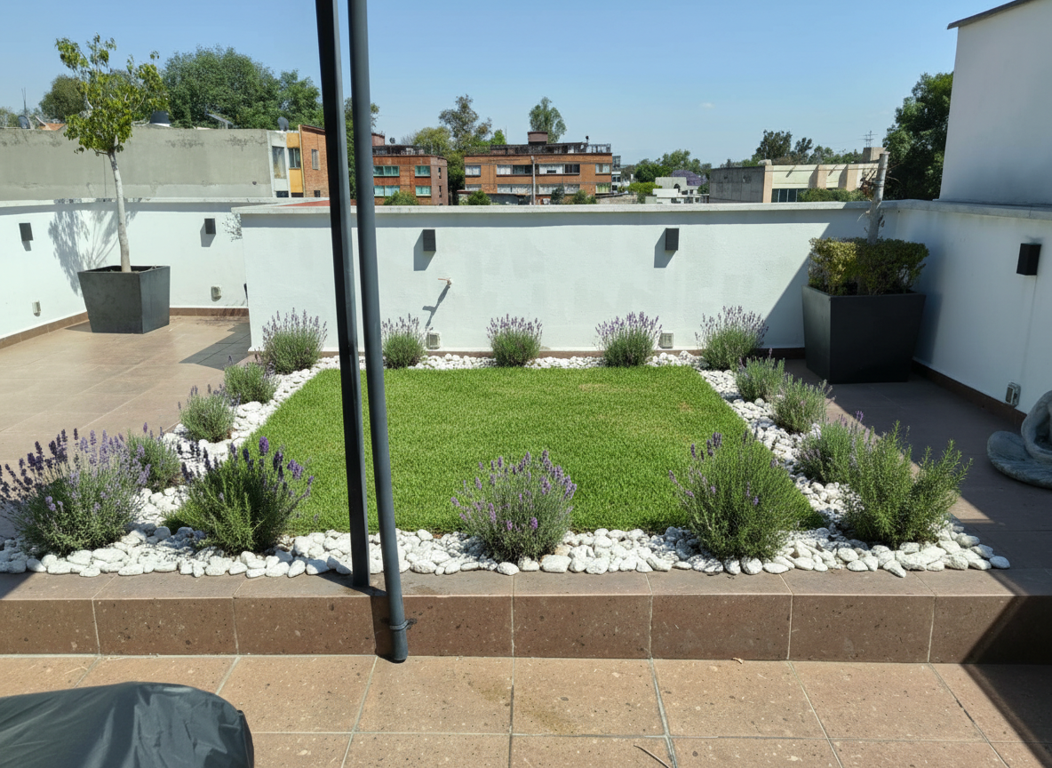 marco de piedras blanca con algunas plantas de lavanda y romero y en el centro pasto